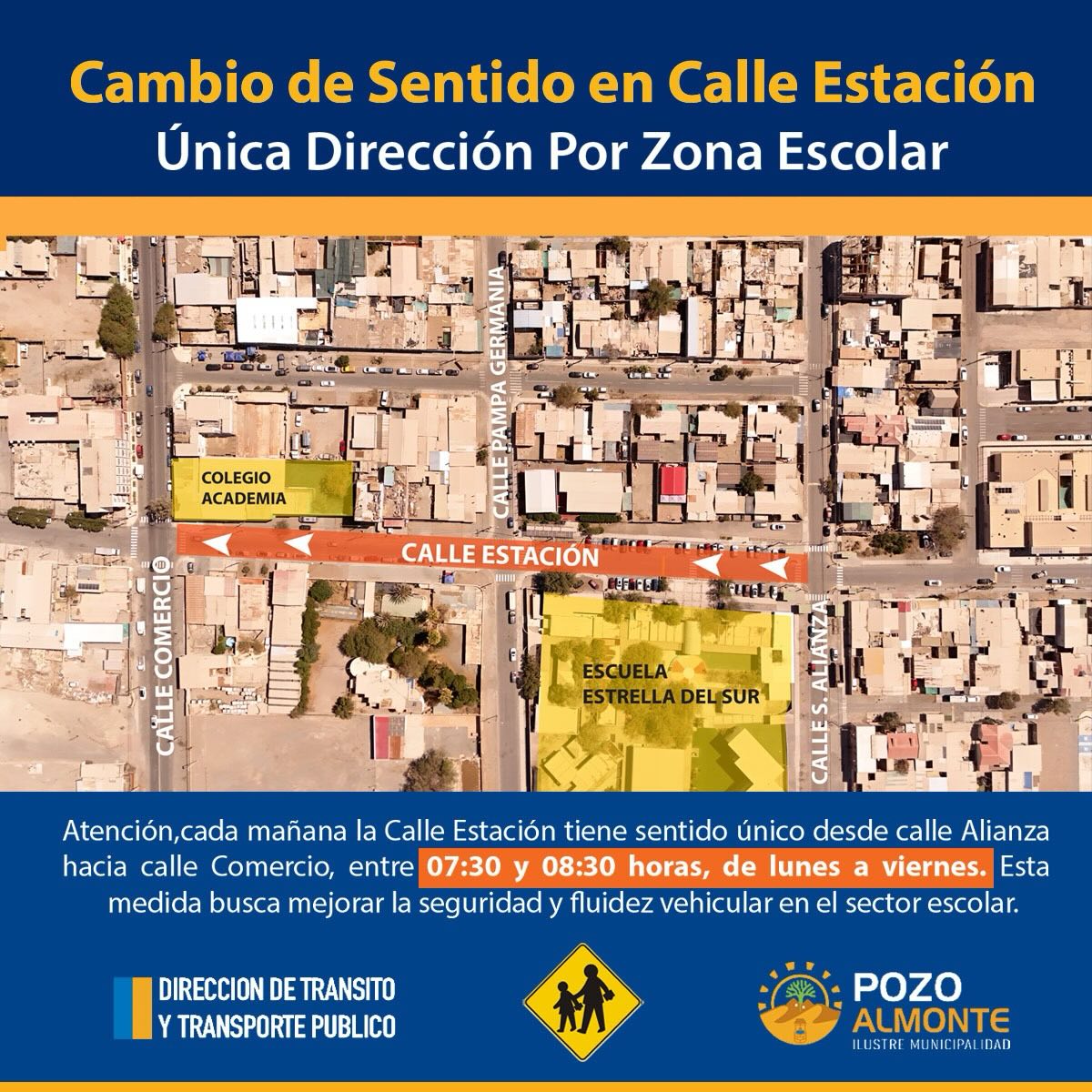 La Municipalidad de Pozo Almonte implementó un cambio de sentido en Calle Estación durante el horario de ingreso escolar, con el objetivo de ordenar el tránsito y reforzar la seguridad de estudiantes, apoderados y conductores en el sector de la Escuela Estrella del Sur y la Academia de Pozo Almonte.